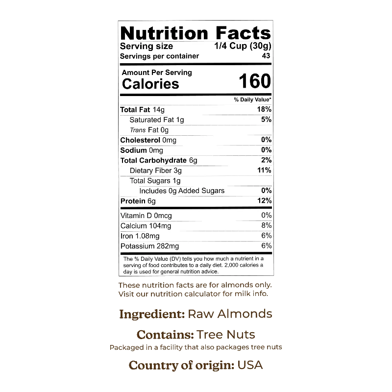 High quality almonds for milking, cooking, or snacking. Our raw almonds are the ideal size to produce silky smooth almond milk, every time.